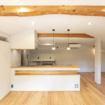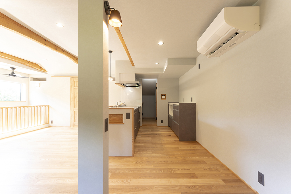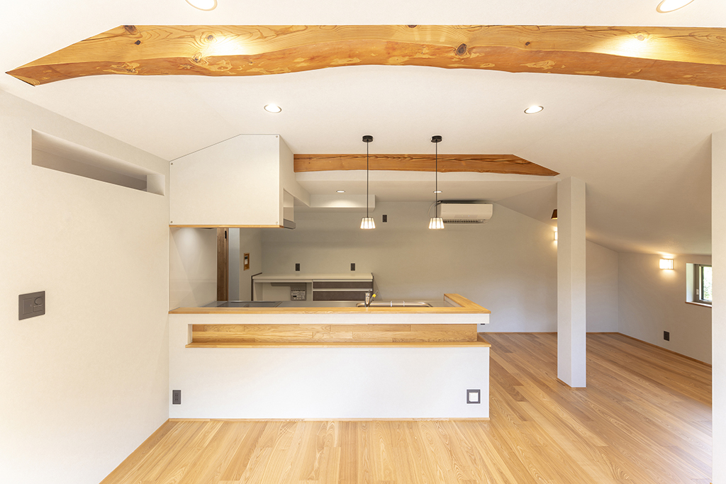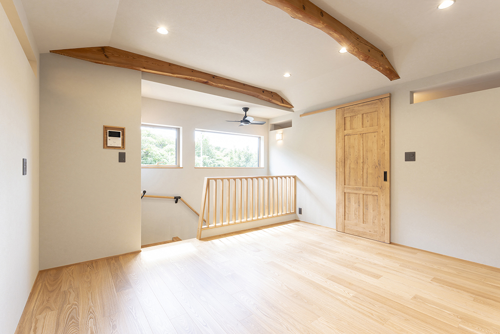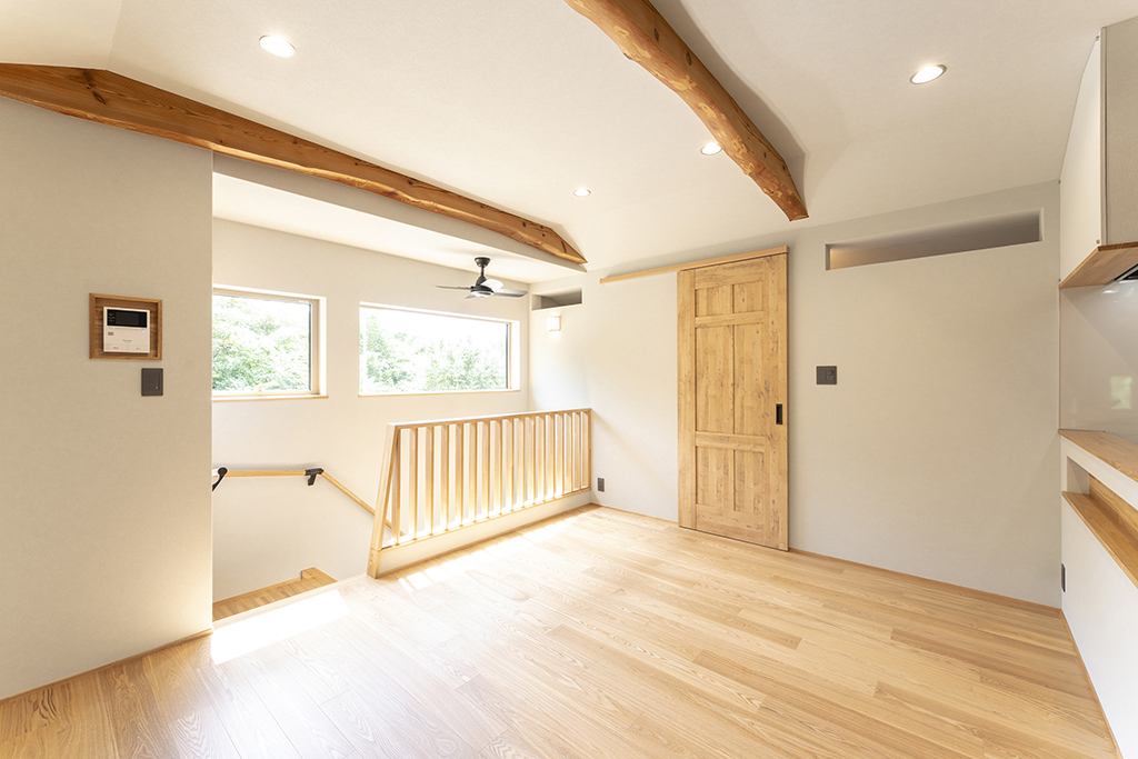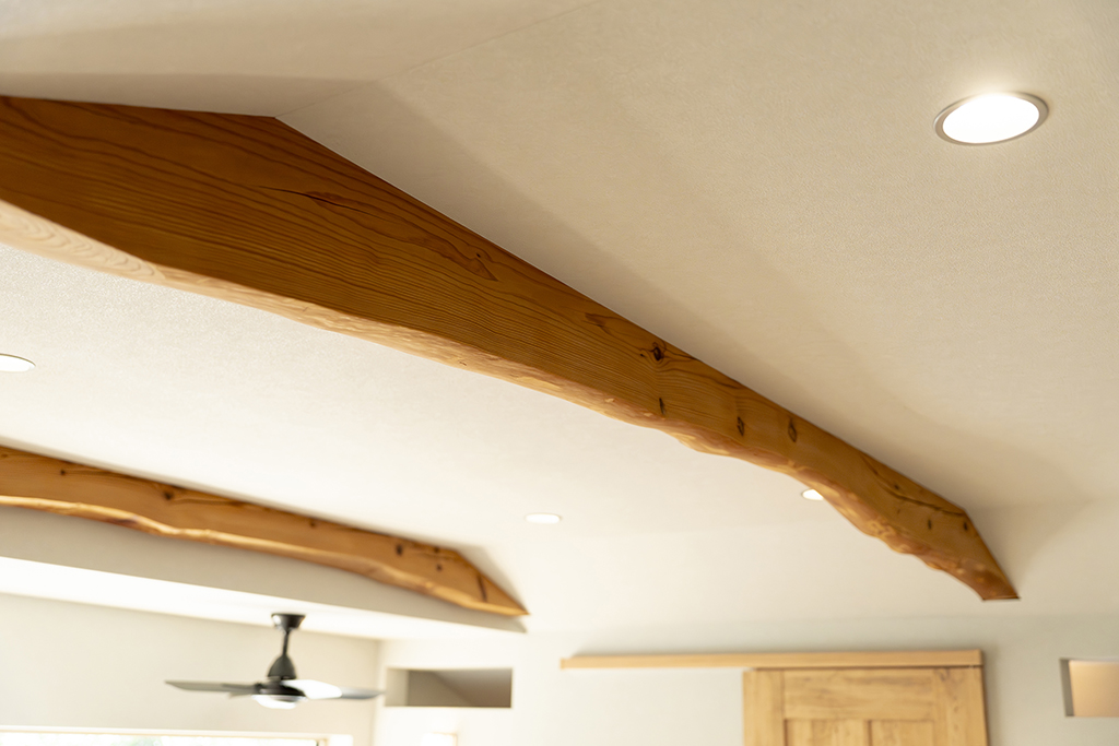 アッシュは木目が強調されて見え、良い意味で荒々しいような木の印象があります。既存の梁を表しにしているので、アッシュの床と相まって木の家の一体感があります。