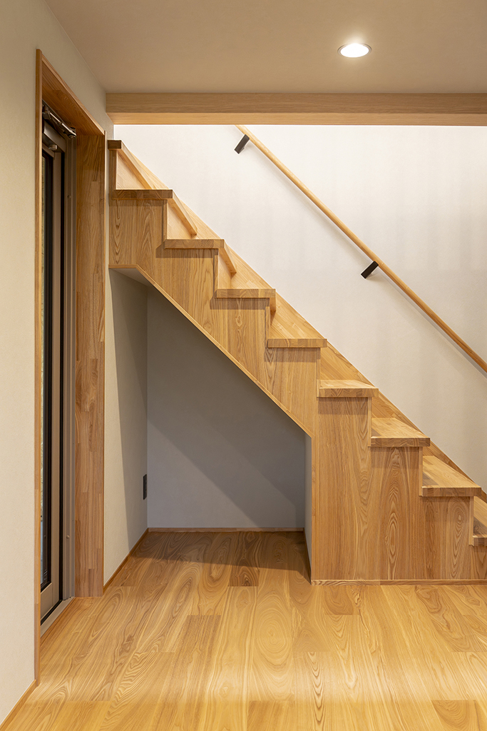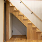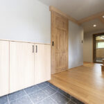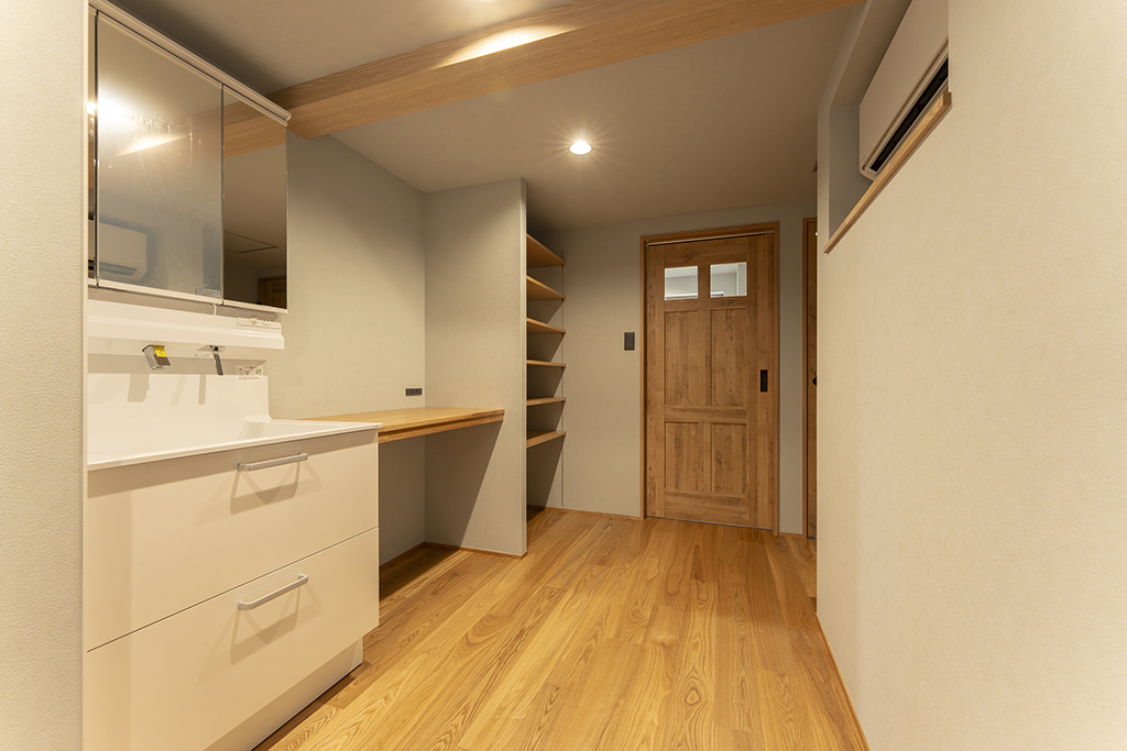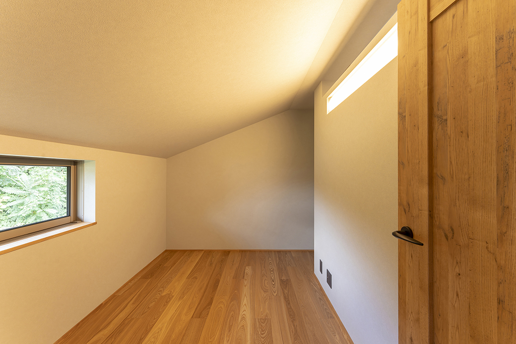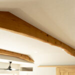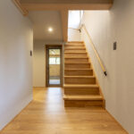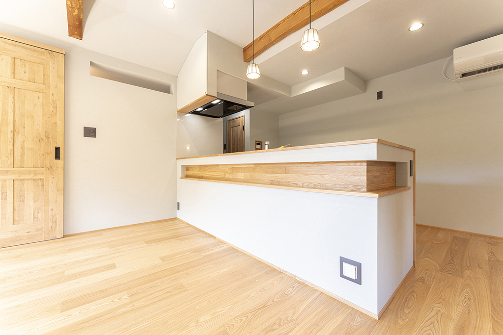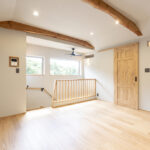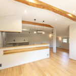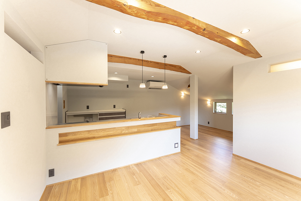 アッシュは木目が強調されて見え、良い意味で荒々しいような木の印象があります。既存の梁を表しにしているので、アッシュの床と相まって木の家の一体感があります。